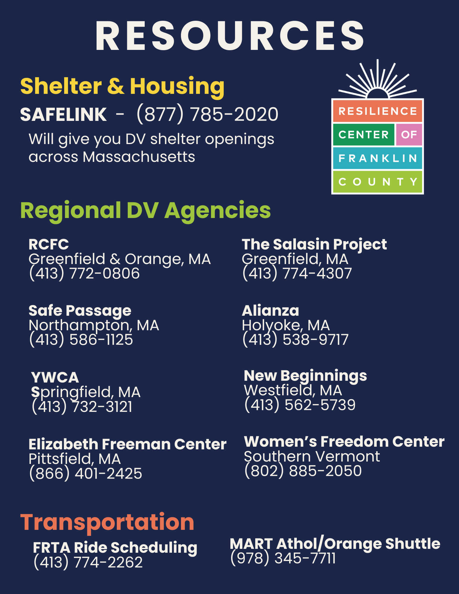 The Center for Women and Community at UMass Amherst, domestic violence hotline, survivor resources including support groups, rape crisis services counseling, referrals
