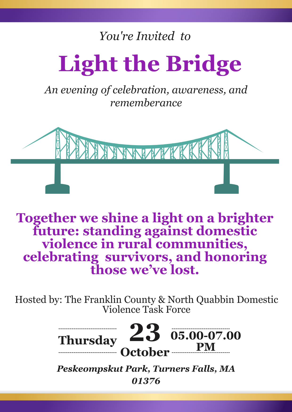 The Franklin County/North Quabbin Domestic Violence Task Force will be hosting Light the Bridge at Peskeompskut Park in Turners Falls on October 23rd.